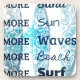 Fun print features all the things beach lovers want : MORE beach, sun, sand, waves and surf. Shades of blue with trio of surboards in background.