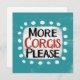 "More Corgis Please" is a cute text design in blue with black and red text, along with a white accent shape and white textured whimsical dots surrounding it.