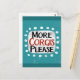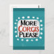 "More Corgis Please" is a cute text design in blue with black and red text, along with a white accent shape and white textured whimsical dots surrounding it.