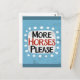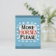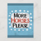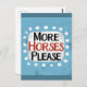 "More Horses Please" is a cute text design in blue with black and red text, along with a white accent shape and white textured whimsical dots surrounding it.