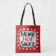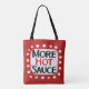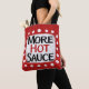 "More Hot Sauce" is a cute text design in red with black and red text, along with a white accent shape and white textured whimsical dots surrounding it.