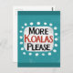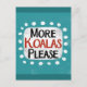 "More Koalas Please" is a cute text design in blue with black and red text, along with a white accent shape and white textured whimsical dots surrounding it.