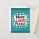 "More Llamas Please" is a cute text design in blue with black and red text, along with a white accent shape and white textured whimsical dots surrounding it.