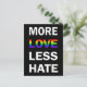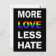 More Love Less Hate Postcards with a bold white text on a black background, and a rainbow pattern in the word love.