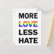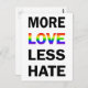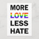 More Love Less Hate Postcards with a bold black text on a white background, and a rainbow pattern in the word love.