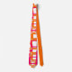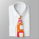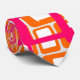 This necktie has a mid-century modern design of open rectangles in pink over open rectangles in orange.