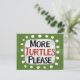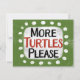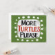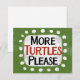 "More Turtles Please" is a cute text design in green with black and red text, along with a white accent shape and white textured whimsical dots surrounding it.