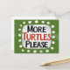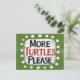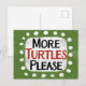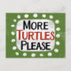 "More Turtles Please" is a cute text design in green with black and red text, along with a white accent shape and white textured whimsical dots surrounding it.
