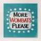 "More Wombats Please" is a fun text design with a white accent shape surrounded by white whimsical textured dots.