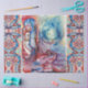 Colourful ,whimsical ,romantic, symbolist contemporary figurative watercolor painting for a spiritual,mystic legend figure in soft blue,pink ,red, purple,violet ,white colours by Alessandro Lumini 1988 .