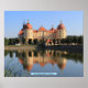 Moritzburg Castle, Germany, with the orange, Baroque domes on the four towers and the yellow walls reflecting in the lake.