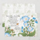 A charming invitation with a grunge background and sprigs of blue morning glory flowers. Busy bees are featured all around the flowers. Perfect for any summer-theme celebration.