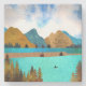 An abstract landscape with unique textures showing a mountain and lake scene with a solitary rowboat and a stunning sunrise and sunrays in shades of blue, teal, cyan, and gold.