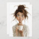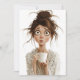 The image depicts a whimsical, exaggerated cartoon-style illustration of a woman with wide, startled eyes, tousled hair in a messy bun, and freckles. She looks dishevelled and confused, holding a white coffee mug in both hands while wearing a light robe with a floral pattern. Her expression suggests she’s either shocked or overwhelmed, possibly after just waking up or experiencing a chaotic moment. The exaggerated features, especially her large eyes and thin, expressive face, add a humourous and relatable tone to the scene.