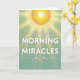Designed with a glowing sunrise scene, the card shows a bright orb near the top sending warm golden rays downward like a gentle embrace. The background shifts from sunlit gold at the top into calm aquamarine and teal below, creating a smooth gradient that feels like two friends watching the day begin together 🌷. Centered in the middle is a white typographic message, with smaller words like “on this” and “of” placed between larger lines to guide the eye. Those smaller words appear in a flowing, cursive-style lettering, adding a soft, romantic touch next to the large all-caps words “MORNING” and “MIRACLES.” The white text stands out sharply against the glowing colors, and a faint shadow under each letter gives it a gentle lift from the background. Beneath the message sits a symmetrical white decorative flourish with curled lines and tiny circular accents, like a quiet promise shared between close companions 🐇. At the very bottom, the teal tones deepen slightly behind the flourish while the rays fade into a soft haze.