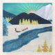 A digital landscape with bright colours and textures showing a musher with a dog sled team and a glowing pink sunrise in shades of blue, gold, cyan, and yellow.