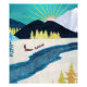 A digital landscape with bright colours and textures showing a musher with a dog sled team and a glowing pink sunrise in shades of blue, gold, cyan, and yellow.