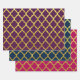 Moroccan arabesque quatrefoil style print in faux gold on three different colors. Tones of golden yellow designed to simulate the color, texture and shine of metallic hammered gold or gold leaf. Purple, blue and dark pink.