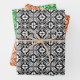 Wrapping paper in a Moroccan inspired tile pattern in black and white, deep coral and pastel orange, and deep and light jade green