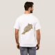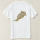 An editable title and slogan accompanies the green five pointed star on a red background of the Moroccan flag on the front of this t-shirt. The back displays a detailed map of Morocco.