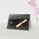 Graduation card with a mortarboard, diploma with a red ribbons and a graduation gown.