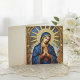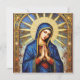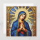 "This exquisite design features a portrait of the Virgin Mary rendered in a rich, detailed mosaic style. She is depicted with a serene expression, eyes closed in prayer, and hands clasped. She is cloaked in a deep blue mantle adorned with gold trim and stars, set against an arched background of a radiant sunburst and starry sky. The intricate mosaic texture and golden accents give the image a sense of sacred grandeur and timeless artistry. This design is highly suitable for products with a religious, historical, or classic art theme. Imagine it on religious icons, devotional items, framed art prints, or elegant stationery."