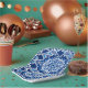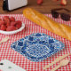 Paper plates in an eight pointed, mosaic, star pattern in dark indigo and cobalt blue, accented with white