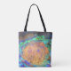This abstract tote bag features a bright mosaic pattern the captures the unique colouring and pattern of a polished abalone shell. The vibrant orange, teal, and purple colouring spirals around the centre of this photo featured on both the front and back of this tote bag.