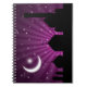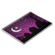 Islamic illustration with silhouettes of the moon, stars and a mosque on a purple night sky.