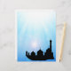 Black silhouette of a mosque on a blue sky with sun and sunrays.
