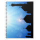 Black silhouette of a mosque on a blue sky with sun and sunrays.