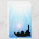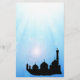 Black silhouette of a mosque on a blue sky with sun and sunrays.