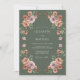 This design features a deep moss green backdrop decorated with moody watercolor florals. The arrangement includes muted mauve roses, terracotta blooms, and soft peach peonies surrounded by delicate foliage. The earthy colour palette and organic aesthetic create a romantic feel for autumnal or winter nuptials.