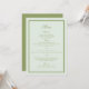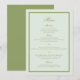 Moss green wedding menu card for a refined estate wedding, featuring elegant calligraphy in a traditional formal and old money aesthetic. Designed for the timeless bride hosting a classic southern or country club wedding, with soft olive green tones and understated luxury. Style with linen napkins, layered place settings, or formal table décor for a cohesive, elevated reception experience.