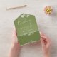 All in one wedding invitation featuring botanical greenery rustic leaves, and elegant typography on a moss green background. The invitation includes a perforated RSVP card featuring a QR code. Designed by Thisisnotme©