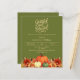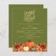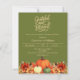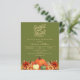 A moss green coloured background. Decorated with pumpkins and orange and yellow flowers. Personalise and add the party details.