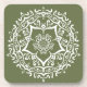 This white mandala sits on a dark moss or olive green background. The colours are harmonious and balanced. Part of the Jarn Mandala Collection.