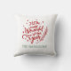 Seasonal throw pillow design features a modern red script "It's the most wonderful time of the year" with green custom text that can be personalised with your last name. Greenery, snowflake and star accent in the design. White background colour.