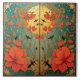 A symmetrical composition features a vibrant arrangement of orange flowers and black moths against a textured, celestial backdrop. The artwork is framed within a dark border adorned with golden corner details, enhancing its decorative appeal. In the center, a large, cracked golden moon, providing a focal point around which the other elements are arranged.