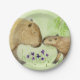 A watercolor painting of a Capybara mother nuzzling noses with her baby adorns these paper plates!