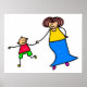 Cute cartoon whimsical illustration of a happy caucasian mother and son stood holding hands. Easily customise and choose your own background colour or add text. Image available on various gifts and products.