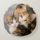 Mother cat fondly grooms and licks her young kitten tenderly, both faces side by side. Mutual grooming shows the friendly relationship between cats. This pet photo fabric print on a smooth round polyester accent pillow is a gift idea for cat lovers. This cute and lovely kitty picture was photographed by Katho Menden http://www.zazzle.com/kathom_photo