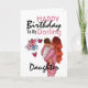 Remind your daughter that she is the love of your life with this beautiful illustration of a blonde haired women holding a brunette caucasian child around which is the lettering in dark pink and blue, happy birthday my darling daughter. A cute and whimsical watermelon pink heart balloon and doodle hearts appear to the left of the mother and child. The inside message, which is customisable, reads,
