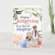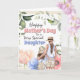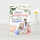 A beautiful illustration of hand drawn mother and daughter illustration framed by eucalyptus leaf and anemone flowers. They are standing with their backs to you and are wearing casual beige shorts and sleeveless blue tank tops plus have straw hats on their heads. Both woman have long brown hair. They are looking across to a field filled with very large pastel coloured anemone flowers and they are framed by soft green foliage leaves. The words, happy Mother's Day to a very special daughter (which may be changed to mum, mother, mummy, mumsy etc) appear above the two woman. The inside has a custom template for your own special message to your daughter or Mum.