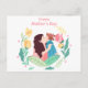 Mother kisses daughter against background of flow holiday postcard