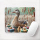 A serene pond scene features a mother mallard duck surrounded by her ducklings, each nestled in colourful floating rings among tall cattails