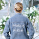Make Mum feel special with a personalised denim jacket! A chic design featuring the phrase "Mother of the Bride" in a stylish script font, and customised with a name, wedding date, location, or any text you choose. Perfect for bachelorette parties, bridal showers, or a fun wedding weekend — it’s a thoughtful and fashionable keepsake your Mum will love! Printed template colour: white on blue denim.