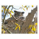 Photo of a mother great horned owl and a baby owl in a nest high in a treetop. The mother owl has one eye open and is looking at the baby, who is yawning. There are three owlets in the nest but only one can be seen from this angle. If you like owl pictures, this is a unique image.