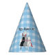 This personalised party hat is blue and white plaid with a smiling white mother cat sitting with her three colourful kittens all wearing pink bows. Customise the Happy Mother's Day text with the template.