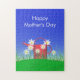 Puzzle with my artwork of a bright red watering can on green grass with daisies and a blue sky. Text says "Happy Mother's Day."
